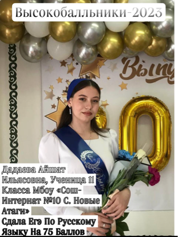 Дадаева Айшат Ильясовна, ученица 11 класса МБОУ "СОШ-интернат №10 с. Новые Атаги" сдала ЕГЭ по русскому на 79 баллов.