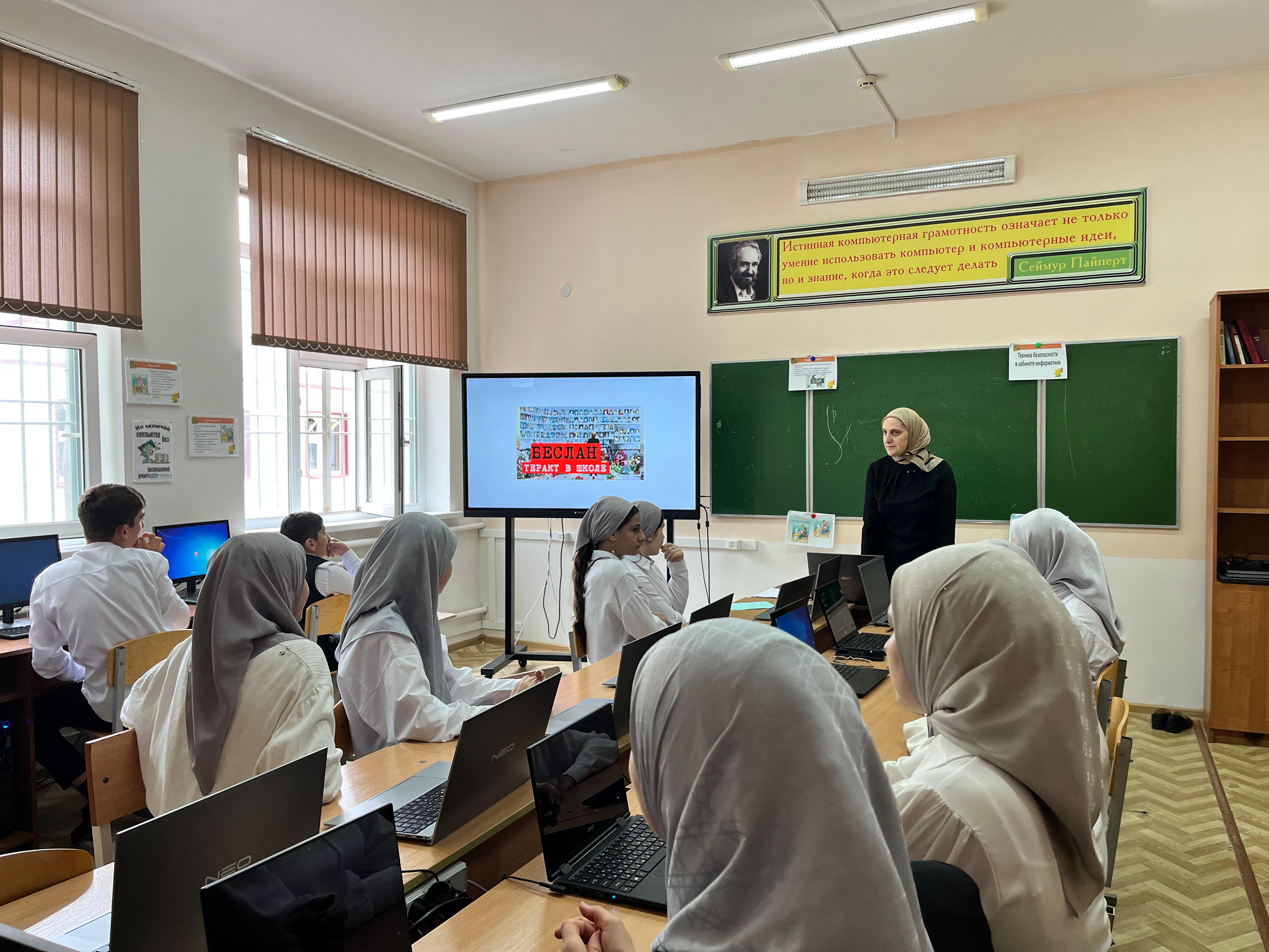 06.09.2024Отделом в Шалинском районе УФСБ России по Чеченской Республике совместно с МУ «Отдел образования Шалинского муниципального района Чеченской Республики» 06.09.2024г. проведено профилактическое мероприятие в МБОУ "СОШ-интернат №10 с. Новые Атаги". на тему: «20 лет захвату школы № 1 в Беслане. Самый страшный теракт в истории России».