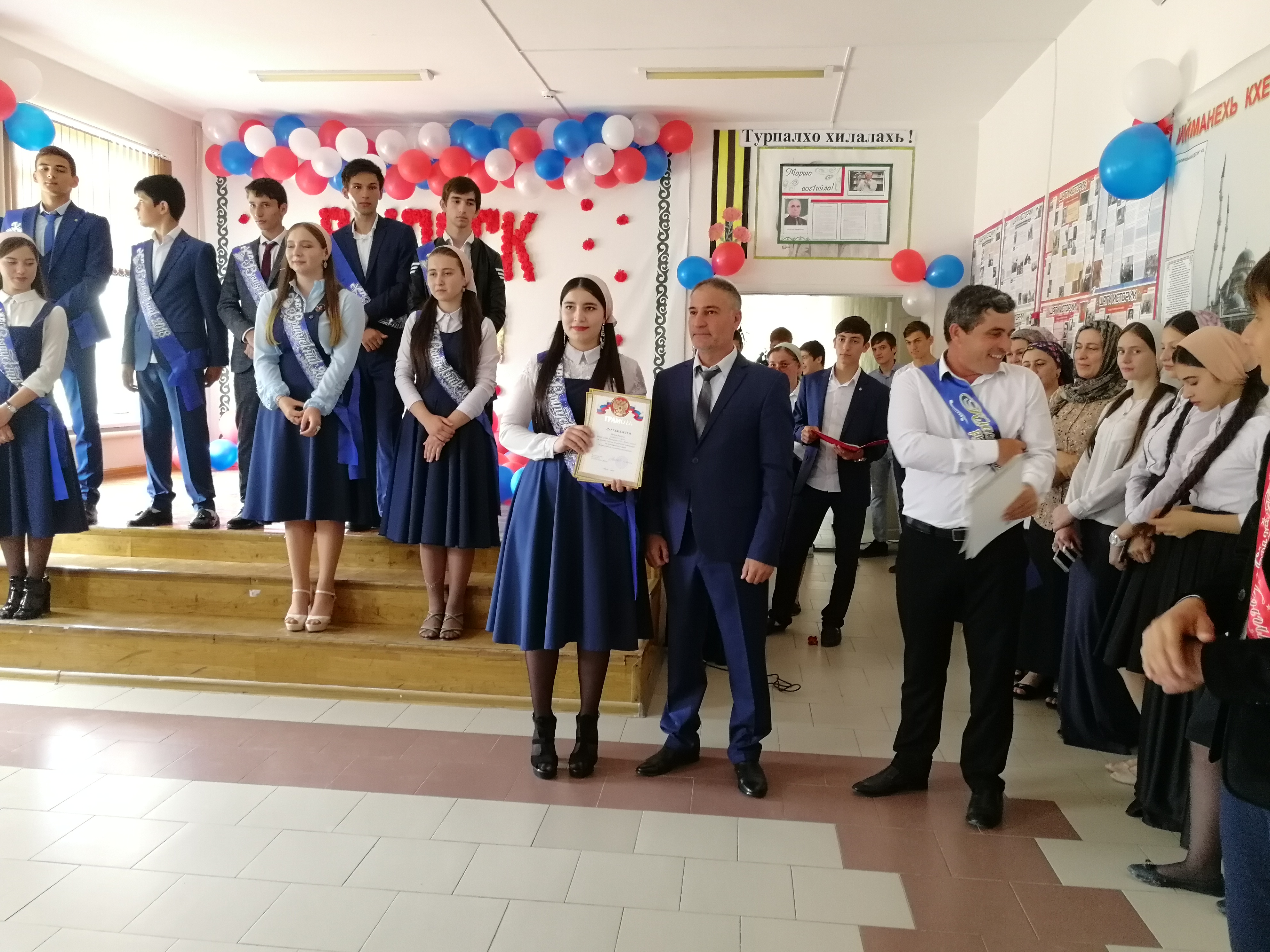 Мероприятие открыл государственный гимн Российской Федерации, после которого выступил директор школы Кадыров А.А., с поздравлениями и пожеланиями выпускникам и тем школьникам, которые после каникул вернутся в родную школу.